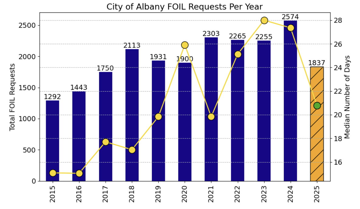 Note, for completeness we show 2025 although this data only covers the first 7 months of the year. If the trend of 2025 FOIL requests remains roughly constant, we expect that the 2025 request volume will exceed 2024 totals of 2,574 FOIL requests.