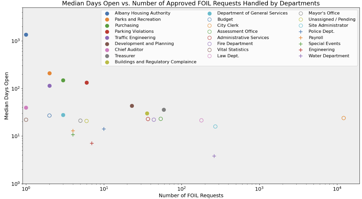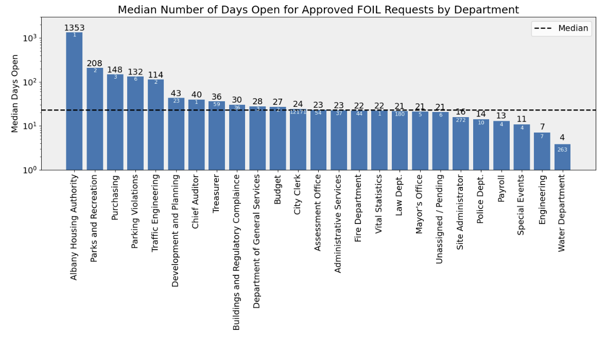 For example, the 1353 days (approximately 3 years and 8 months) needed for the Albany Housing Authority to provide information for its singular “Approved” FOIL request cannot be directly compared to a median of 11 days needed by Special Events, which had a total of four approved FOIL requests during the same span. Larger agencies that handle and process many FOIL requests weigh heavily on the median value, such as City Clerk (12171), Water Department (263), Law Dept. (180), and Site Administrator (272).