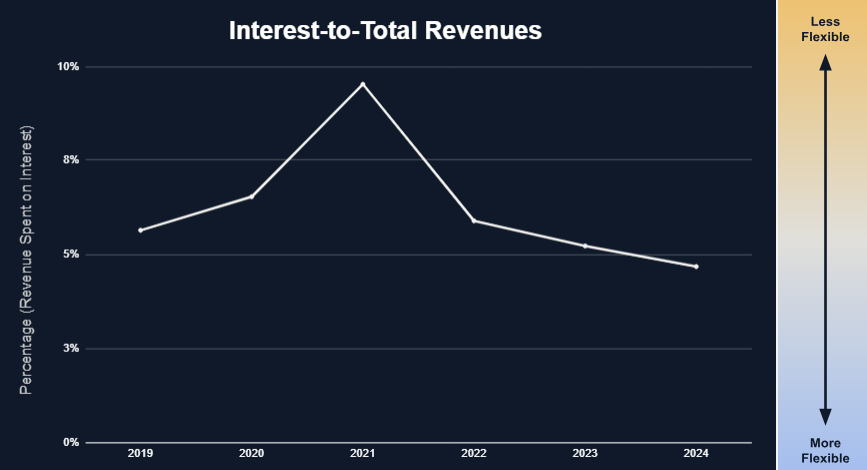 This shows how much of the budget is consumed by past borrowing. The higher the percentage, the less room for services, maintenance, or investment.