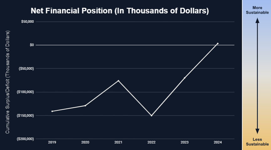 A positive net financial position suggests the city has more financial assets than obligations and is in a better position to weather downturns, invest in infrastructure, or respond to emergencies without resorting to borrowing or service cuts. If this number is negative, the city has spent more than it has saved and is relying on future revenue to pay past bills.