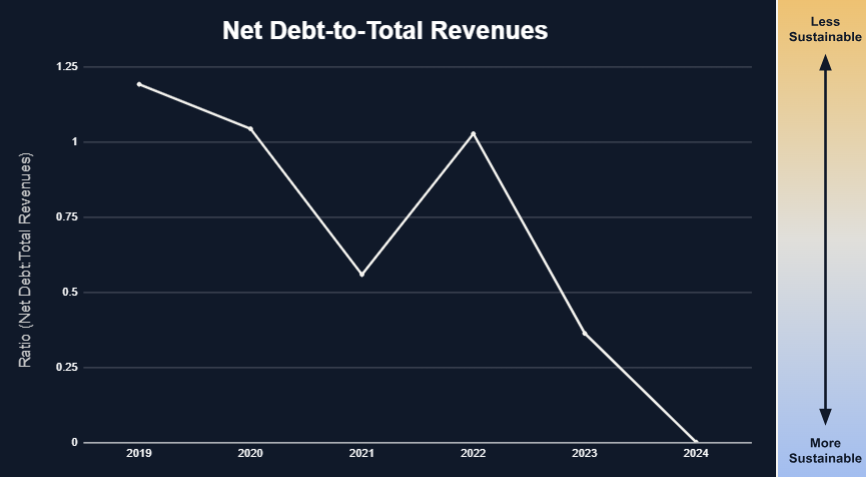 If the ratio is rising, debt is growing faster than income—this is unsustainable. If it’s falling, the city is gaining control of its obligations.