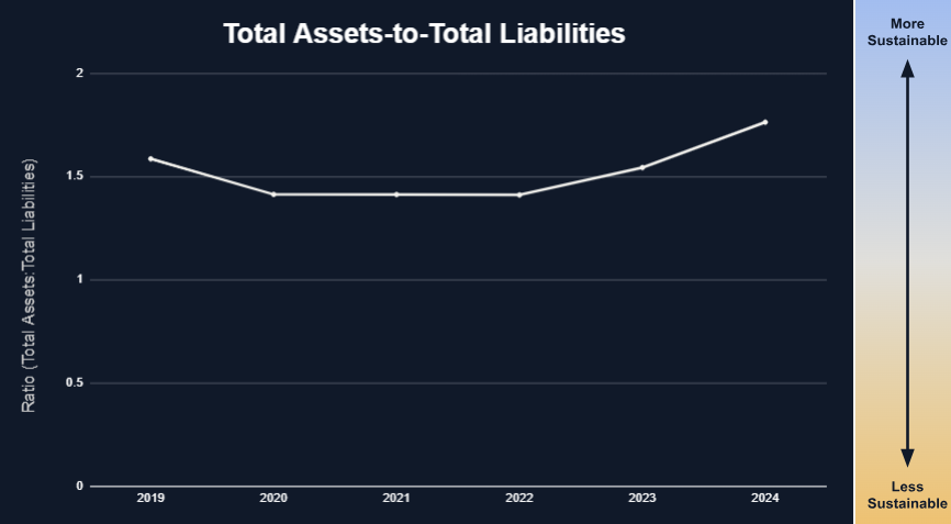 Recent betterment of our ratio is driven by a shrinking of our Total liabilities between 2022 and 2024, with our liabilities decreasing by $112 million ($503m to $391m).