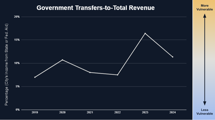 High dependency on outside funding makes the city vulnerable to political or economic shifts beyond its control.