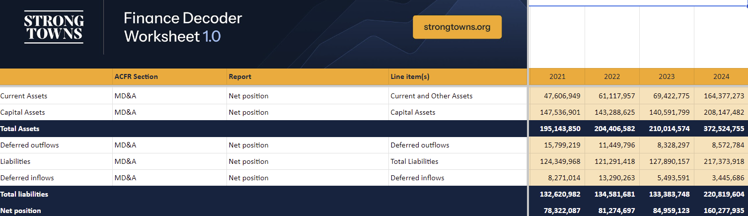 A positive net financial position suggests the city has more financial assets than obligations and is in a better position to weather downturns, invest in infrastructure, or respond to emergencies without resorting to borrowing or service cuts. If this number is negative, the city has spent more than it has saved and is relying on future revenue to pay past bills.