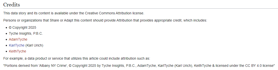 The credits for the data story will include the Author, all editors, any other contributors (e.g. providing advice, data visualizations) and Tyche Insights. We will use the Creative Commons recommended practices for attribution.