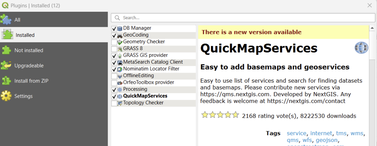 - Select “QuickMapServices” and install it - after which you’ll see it under “Installed”